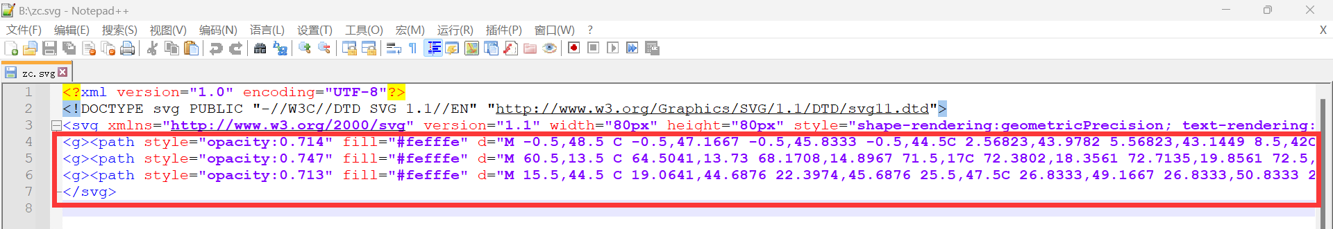 2、使用编辑器打开svg文件,我用的是notepad,打开之后如下图所示,复制第四行