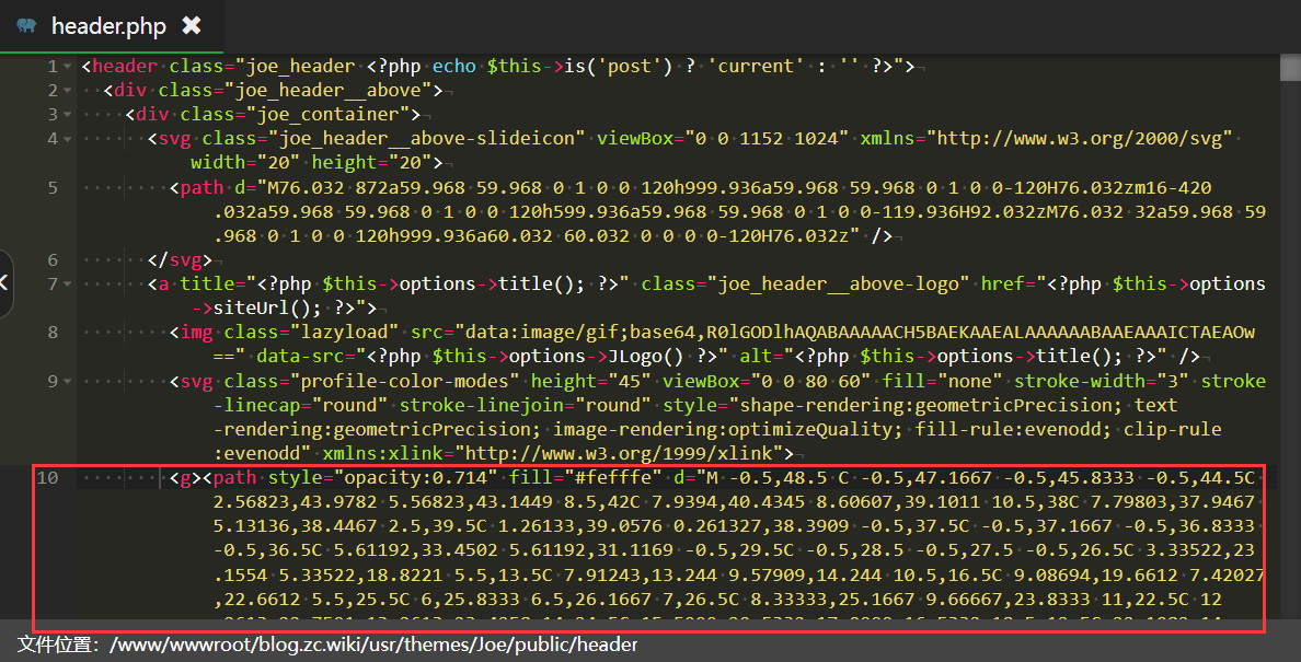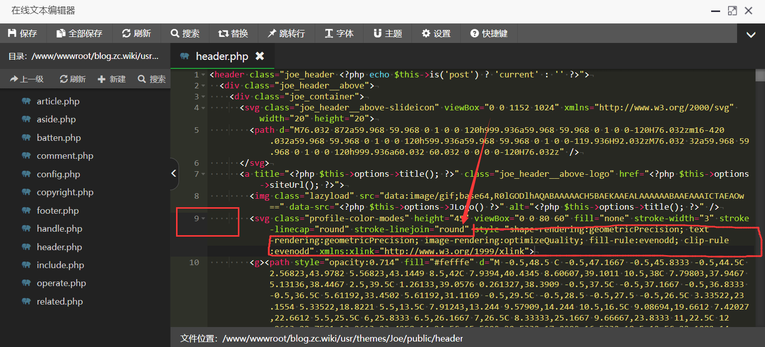 6、回到第四步,也就是进入header.php,找到第9行的stroke-linejoin=”round”,在后面粘贴上刚刚复制的内容,如图所示