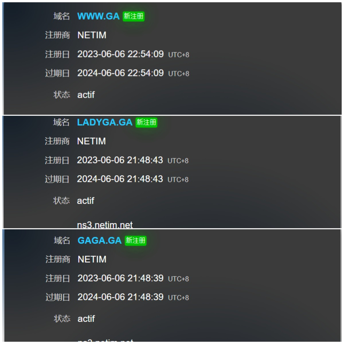 在6月6日晚间,部分极品前缀被米友成功注册,包括www、gov、dns、domain、whois等,也有一些较为有意思的域名,比如gaga.ga,还有明星的姓名,比如ladygaga的ladyga.ga均被注册。