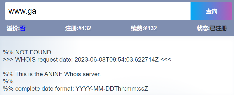但是在6月8日当天,有米友发现有的域名被“ga”了,在6日注册的www.ga、whois.ga等域名目前显示已注册,但是已经无法查询到whois信息,米友猜测该类域名已经被加蓬当局收回并保留。