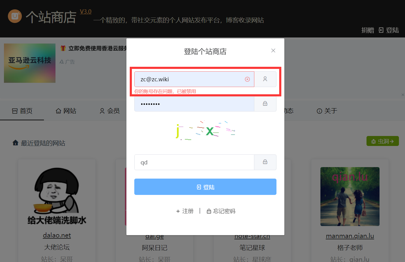 在我发完文章之后,在个站商店中把文章发给站长看了一下,不出所料,给我账号禁用了。好吧,反正我也不打算再访问个站了,祝个站蒸蒸日上吧。