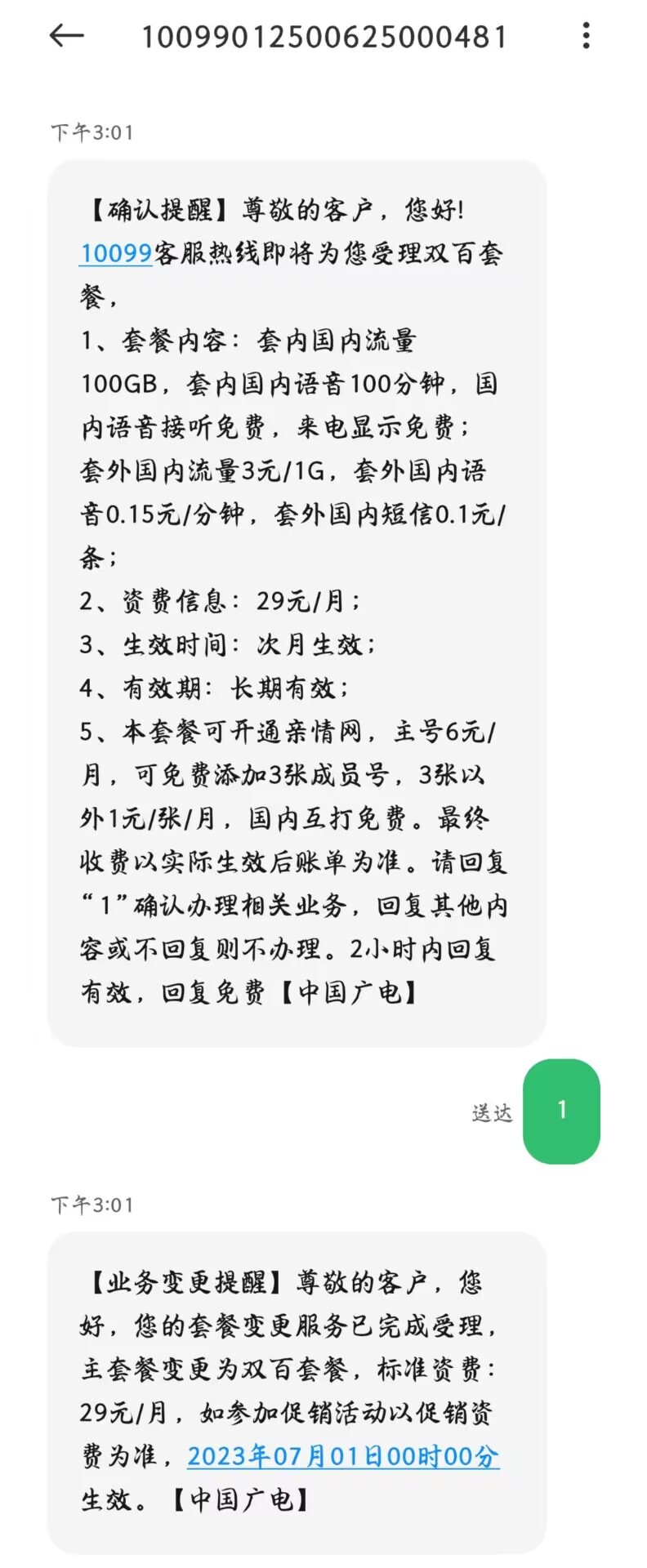 在2:56左右,客服再次联系到我。先跟我确认了一下套餐变更的申请,并且说明了一下,这个套餐有的用户是变更成功的,有的是变更失败的(我怀疑是有合约的用户,但是网上有合约的用户缴纳违约金之后也是成功变更的),然后在通话过程中进行了办理,首先是转到验证系统,需要验证一下服务密码(这个可以提前修改一下),然后客服会通过系统下发一条变更短信,需要根据短信内容回复“1”